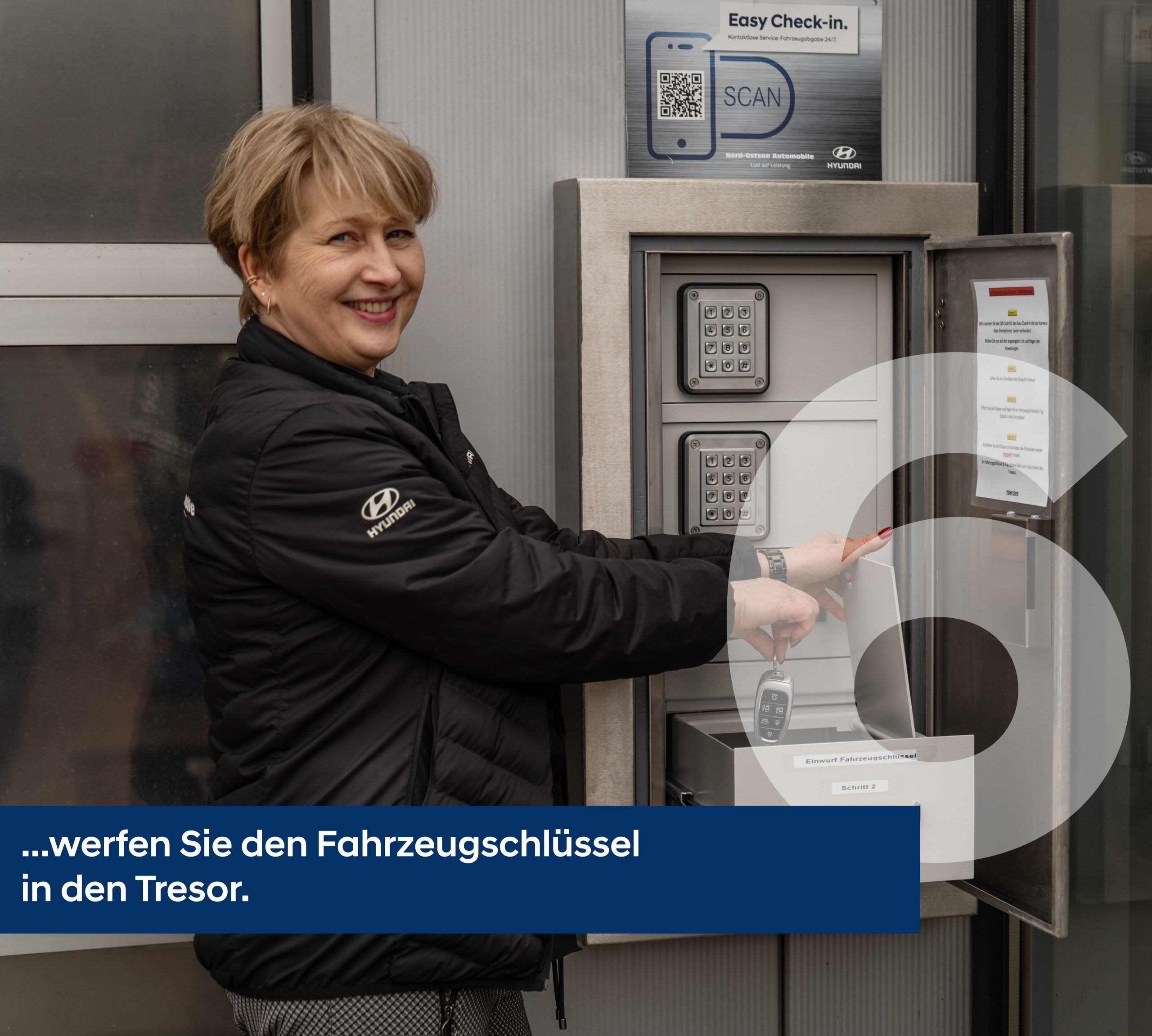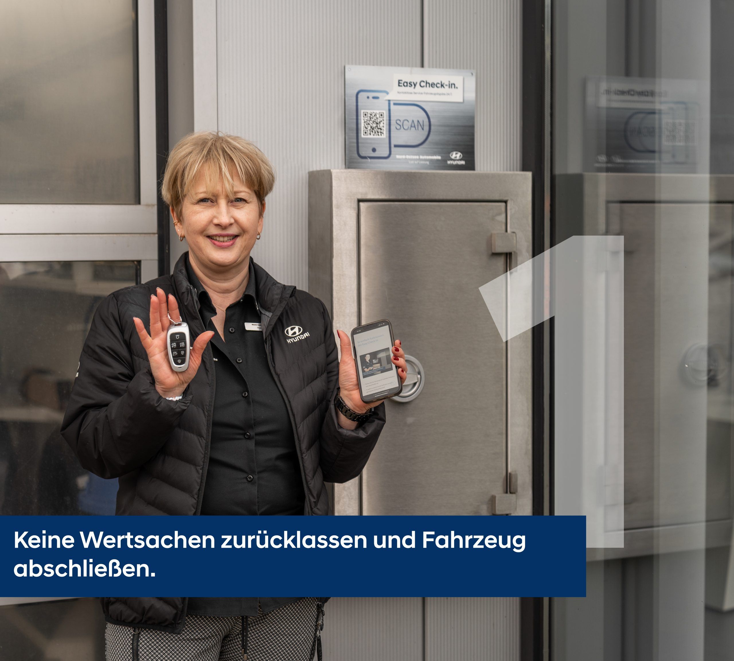 Ihr Fahrzeug soll zum Service, aber Sie können nur außerhalb der Öffnungszeiten zu uns kommen? Bringen Sie uns Ihr Fahrzeug einfach vorbei, wenn es am besten für Sie passt. Der digitale Easy Check-in macht es möglich. Den Code im Tresor scannen, der Anleitung folgen und eine digitale Bestätigung erhalten. Fertig!